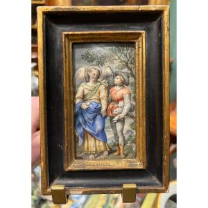 Arcangelo Raffaele e Tobia – Miniatura su pergamena. Italia centrale, XVIII secolo. Cornice coeva.