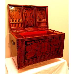 ELEGANTE CASSA DA VIAGGIO IN LEGNO LACCATO DI ROSSO E NERO CON IMPORTANTI DECORI IN ORO