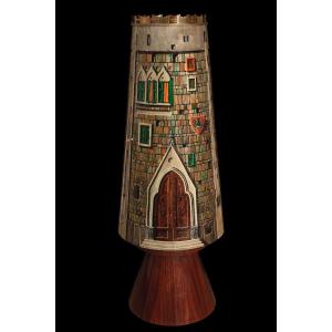 Il mobile, dalla curiosa forma quasi conica, è decorato dal disegno di un palazzo gotico veneziano dai toni bruni e le persiane verde acceso; la sommità culmina con un ornamento merlato in ottone che ricorda quello dei castelli medievali. Dal design ecclettico e innovativo, all’interno presenta tre ripiani in vetro e un meccanismo che permette l’accensione di una lampada ogni qualvolta il mobile venga aperto.