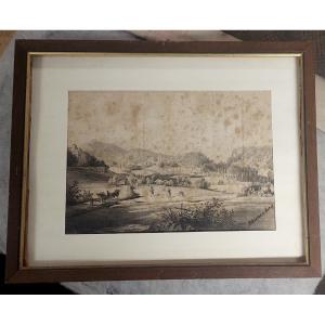 Disegno antico di ottima fattura , China su carta raffigurante Gleichenberg Austria con personaggi , periodo XIX secolo. Reca delle scritte sia nel retro che nella parte bassa a dx ma poco leggibili , macchie e segni del tempo. Misura 30 x 20 cm