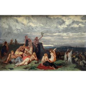 L’opera rivela una solida preparazione accademica e una conoscenza evidente dei modelli dell’antichità e dei maestri del passato. I volumi dei corpi sono costruiti attraverso pennellate ampie, quasi scultoree, che conferiscono alle figure una forte presenza plastica. A questa impostazione strutturata si affianca una pittura libera, attenta all’effetto d’insieme e alla forza espressiva della scena. Il dipinto si presenta come un lavoro in corso, in cui la freschezza dell’esecuzione si combina con una concezione intellettuale ben definita. Questa tensione tra rigore formativo e spontaneità pittorica accentua la dimensione sacrale della figura femminile e la carica simbolica dell’insieme, collocando l’opera a un punto di incontro tra accademismo, immaginario storico venato di esoterismo e un sottile sentimento patriottico tipico del clima culturale dell’epoca. Il soggetto si inserisce nel revival dell’immaginario celtico che caratterizza la Francia intorno al 1870, alimentato dall’interesse per le tradizioni spirituali pre-cristiane e da correnti intellettuali sensibili al simbolismo e alle ricerche esoteriche diffuse in ambito europeo. La tavola reca sul retro il timbro del fornitore parigino di belle arti: « VIEILLE – marchand de couleurs, rue de Bréda 30, Paris ». La rue de Bréda (attuale rue Henry-Monnier) mantiene questa denominazione fino al 1880, elemento che consente di collocare l’acquisto del supporto e la realizzazione dell’opera prima di tale data, verosimilmente attorno al 1870. I pannelli in legno di acajou forniti dai mercanti di colori erano apprezzati dagli artisti per la loro stabilità e qualità, particolarmente adatti alla pittura a olio.