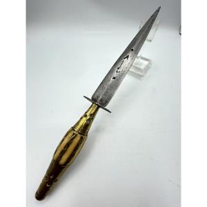 Coltello in ferro forgiato multimateriale in osso materiale e ottone. Lama parzialmente incisa.