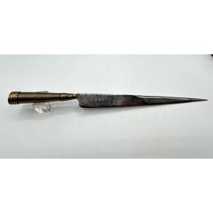 Coltello in ferro forgiato multimateriale con manico eseguito applicando del filo di ottone su base di legno, con punta rinforzata.