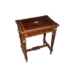 Toilette francese di metà 1800 stile Luigi XVI in legno di radica di maples e bois de violette. Presenta specchierina interna vani a giorno e 4 gambe riunite da crociera impreziosita da applicazioni in bronzo e avorio.