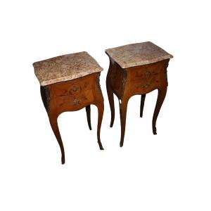Coppia di comodini francese di fine 1800 stile Luigi XV in legno di bois de rose. Presentano piano in marmo, due cassetti, motivi di intarsio floreale e applicazioni in bronzo.