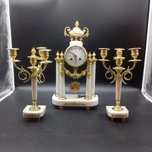 Orologio a pendolo completo dei suoi candelabri realizzato in marmo bianco di Carrara e bronzo dorato della seconda metà del XIX secolo. Presenta una forma a portico poggiante su base a demi lune con decorazione in bronzo dorato nella parte centrale e poggiante su quattro piccoli piedini, da dove si ergono le quattro colonne con basi e capitelli in bronzo sormontate da quattro piccole pigne a chiusura. Le quattro colonne sorreggono la cassa dell'orologio che presenta un quadrante in smalto bianco con doppio foro di carica, con numeri arabi è decorato con ghirlande floreali. Sotto la cassa ricca decorazione in bronzo dorato a foggia di ghirlanda di fiori. Parte superiore con grande pigna centrale realizzata in marmo bianco e arricchita da guarnizioni in bronzo dorato. Pendolo dell'orologio in foggia di vaso di fiori realizzato in bronzo. Candelabri sempre con base a demi lune anch'essi con decorazione in bronzo dorato nella parte centrale e sorretto da quattro piccoli piedini in bronzo, con fusto a colonna con base e capitello realizzato in bronzo a motivo di foglie d'acanto, dalla quale si dipartono tre bracci in foggia di tralci fogliacei e braccio centrale ornato a motivo di foglie. L'orologio è funzionante e suona le ore e le mezze ore.