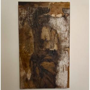 La scultura è un magistrale assemblaggio di materiali: applicazioni di fogli di legno su legno formano il corpo del Santo, mentre bruciature sapientemente dosate evidenziano le parti anatomiche, conferendo profondità e drammaticità. L'artista ha scelto di integrare chiodi in ferro del 1600, un dettaglio che aggiunge un fascino storico e una dimensione tattile sorprendente, creando un dialogo tra epoche diverse.