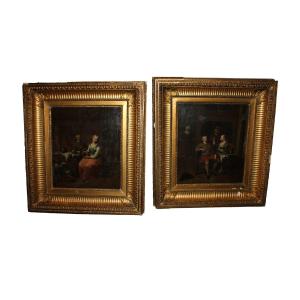 Raffinata coppia di oli su tela francesi risalenti alla fine del 1700, raffiguranti eleganti scene di interni con personaggi, tipiche della pittura di genere settecentesca. Le composizioni raccontano momenti di vita quotidiana in ambienti domestici, con grande attenzione ai dettagli.
