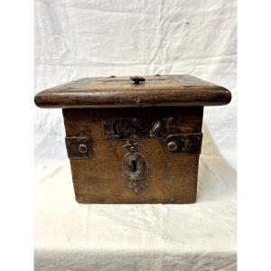 Elemosiniere in legno di noce con fasciature in ferro forgiato. Questo manufatto originariamente portava una sola chiave, poi in un secondo tempo e' stato adibito per due chiavi di cui una mancante.