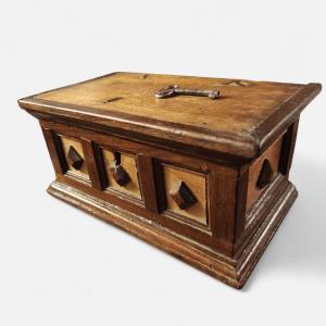 Bella scatola toscana in noce pannellature quadrangolari a inquadrare losanghe e basi modanate, pannellature anche sui fianchi. Serratura coeva funzionante
