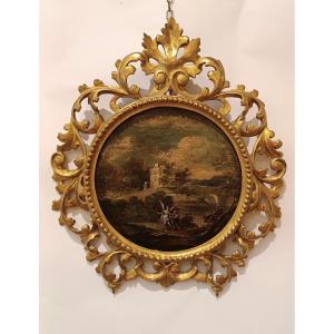 Favoloso dipinto circolare ad olio su tavola di noce, in cornice di legno intagliato e dorato a foglia d'oro. Nel quadro è raffigurato un paesaggio collinare, in cui si scorgono architetture e alberi. Tra questi, in primo piano, sono raffigurate due figure identificate come Tubiolo e l'Arcangelo Raffaele. Si tratta di un soggetto biblico contenuto nel Libro di Tobia, in cui l'Arcangelo Raffaele aiuta Tubiolo nel suo viaggio, salvandogli la vita più di una volta. Questa raffigurazione fu inoltre particolarmente in voga durante la Firenze del Rinascimento, poiché si riteneva a protezione dei giovani che partivano in viaggio. Il dipinto è in buone condizioni e sul retro presenta la data (1600) e alcune iscrizioni relative all'artista. Manifattura fiorentina degli inizi del XVII secolo.