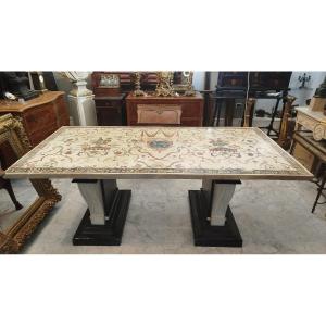 Scultura realizzata in scagliola, databile al XVIII secolo. L’opera poggia su una base in marmo nero del Belgio e marmo bianco statuario, materiali pregiati tipici dell’epoca. L’insieme riflette il gusto decorativo e la raffinatezza formale del periodo.