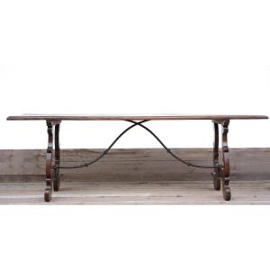 Descrizione: Meraviglioso tavolo fratino veneto in noce risalente alla fine del Seicento, caratterizzato da una linea solida ed elegante, tipica dell’arredo nobile dell’epoca. Il lungo piano rettangolare, di grande presenza scenica, poggia su gambe sagomate a lira finemente modanate, unite da una traversa in ferro battuto arcuata che conferisce stabilità e slancio alla struttura.