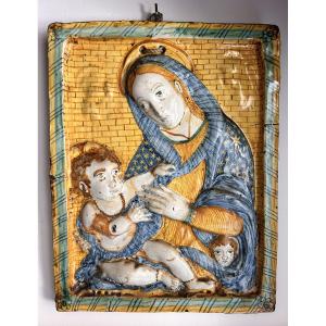 Importante placca in ceramica policroma di Deruta lavorata a basso rilievo e raffigurante Madonna con bambino.
