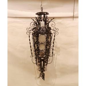 Raffinata lanterna a sospensione in latta battuta. La lanterna è caratterizzata da una struttura caratterizzata da decorazioni a ricciolo, intrecciate e fitomorfe. Al centro invece presenta una forma esagonale, di cui per ogni lato sono inseriti tre dischi di vetro incolore, soffiato in vario modo, che donano ulteriore eleganza all'insieme. Si tratta di un oggetto di grande gusto e raffinatezza, in grado di donare un tocco di classe ed antichità a qualsiasi ambiente. Manifattura italiana del perido Liberty, intorno alla fine del XIX secolo.