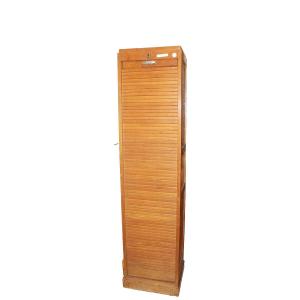 Mobiletto da ufficio porta documenti francese di inizio 1900 in legno di rovere. Presenta 1 anta centrale a serranda con chiave ed internamente ripiani in legno.