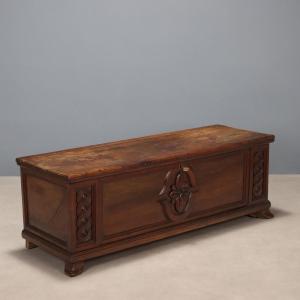 Cassapanca in noce. Fronte con applicazione di intaglio floreale centrale e lateralmente intaglia a girali. Piedi a mensola. Modifiche. Italia, fine XVIII Secolo.