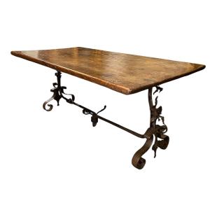 Imponente tavolo a fumo in legno di noce, XIX secolo. Il mobile si distingue per un piano rettangolare che poggia su una raffinata base in ferro battuto forgiato a mano, composta da due sostegni laterali con eleganti volute decorative e collegati da una traversa centrale.