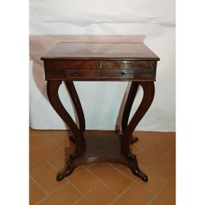 Raffinato tavolino da lavoro, in legno di mogano finemente intagliato. Il tavolino presenta quattro gambe arcuate che si ricongiungono su di una base alla fine, e piedi anch'essi ricurvi. Sul fronte è caratterizzato da un cassetto apribile, al cui interno sono presenti piccoli cassetti per alloggiare oggetti da cucito ed un porta aghi in stoffa amovibile. Il piano è inoltre ribaltabile, ed apribile mediante una piccola chiave in bronzo, scoprendo al suo interno ulteriori piccoli cassetti e uno specchio, il quale consente di utilizzare il mobile anche come toilette. Si tratta di un tavolino di grande gusto e raffinatezza, in grado di donare un tocco di classe ed antichità a qualsiasi ambiente. Manifattura livornese (costa toscana, centro-Italia) del periodo Impero, intorno ai primi del XIX secolo.