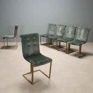 Set di sedie vintage con struttura in metallo ottonato, seduta imbottita in espanso con rivestimento in tessuto originale del periodo nei toni del verde/turchese.