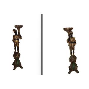 Elegante coppia di sculture raffiguranti Mori Veneziani finemente intagliati in legno e impreziositi da dorature. Le figure, vestite con abiti orientaleggianti ricchi di dettagli, sorreggono coppe superiori utilizzabili come porta vaso o elementi decorativi.
