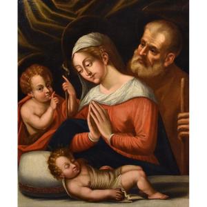 Ad arricchire questa canonica Sacra Famiglia appare sulla destra il piccolo San Giovanni Battista che, come volendosi rivolgere direttamente allo spettatore, fa cenno di silenzio con le mani per non disturbare il piccolo dormiente e per invitarlo a contemplare la scena con devozione.