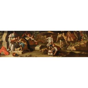 Osservando la tela nel suo aspetto compositivo, con la sua tavolozza scintillante, i gesti teatrali che animano i personaggi, la brillantezza narrativa e piacevole qualità pittorica, possiamo agevolmente avvicinarne la paternità alla mano di Francesco de Mura (Napoli, 1696 - 1782), uno tra i maggiori interpreti della pittura napoletana del XVIII secolo, o ad un autore della sua bottega.