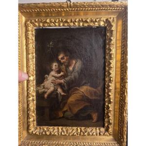 Dipinto raffigurante di San Giuseppe con il Bambino Gesù. Epoca barocca.
