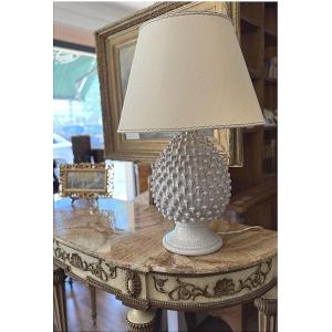 Elegante lume da tavolo a forma di pigna, realizzato in ceramica e riconducibile alla tradizione decorativa siciliana. Databile alla seconda metà del Novecento, presenta una base scultorea con tipica lavorazione a rilievo che richiama il simbolo della pigna, elemento iconografico molto diffuso nell’arte ornamentale mediterranea, simbolo di prosperità, accoglienza e buon auspicio.