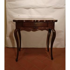 Raffinato tavolino da gioco, in legno di noce massello. Il tavolino presenta gambe ricurve, con intagli geometrici sul fronte ed un piccolo cassetto ergonomico per riporre oggetti. Il piano è mosso, ed è doppio in quanto apribile. Il retro infatti è amovibile, consentendo di allargare la profondità, in modo da posare il piano aperto. Quest'ultimo presenta le caratteristiche tipiche del piano da gioco, con rivestimento in pelle, ulteriormente decorato da dorature. Si tratta di un tavolino di grande gusto e raffinatezza, in grado di donare un tocco di classe a qualsiasi ambiente. Manifattura francese del periodo Luigi Filippo, intorno alla metà del XIX secolo.