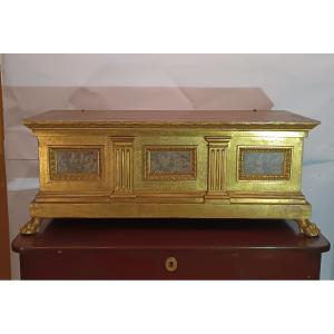 Elegante ed unica piccola cassa in legno intagliato e dorato, con formelle in pietre dure. La cassa si presenta rettangolare in pieno stile rinascimentale, con gambe zoomorfe ed un fronte caratterizzato da una forma a tempietto con lesene e modanature. All'interno l'oggetto è inoltre rivestito in tessuto, a motivo floreale, nei toni dell'oro e del rosa. Si tratta di una cassa di grande gusto e raffinatezza, in grado di donare un tocco di classe ed antichità a qualsiasi ambiente. Manifattura toscana, del periodo neo-rinascimentale, intorno alla metà del XIX secolo.