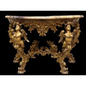 Consolle in legno intagliato e dorato. Quattro gambe arcuate con figure femminili alate raccordate da crociera. Piano in marmo broccatello di Siena.