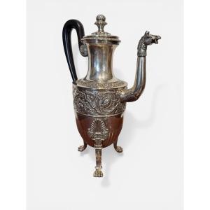 Importante caffettiera in argento realizzata a Torino intorno al 1840 dall’orafo Pietro Borrani, noto argentiere attivo come fornitore della Real Casa di Savoia. Il corpo, impostato su tre piedini ferini, è riccamente decorato a rilievo con eleganti motivi vegetali e volute di gusto tardo neoclassico. Il beccuccio è modellato a forma di testa di cavallo, elemento scultoreo di grande carattere, mentre il manico arcuato è realizzato in legno ebanizzato. Il coperchio è sormontato da un raffinato pomolo a pigna. La qualità dell’esecuzione, la ricchezza della decorazione e la presenza dei punzoni torinesi rendono questo oggetto un significativo esempio dell’argenteria piemontese della metà del XIX secolo.
