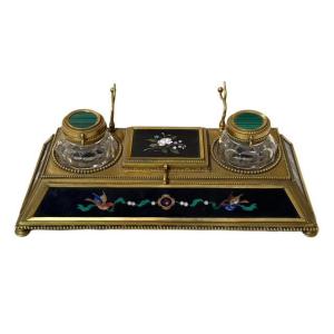 Calamaio in bronzo dorato e pietre dure a motivi floreali e uccelli, due portainchiostro in vetro con coperchi in bronzo e malachite, vano centrale apribile.