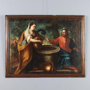 Olio su tela. Scuola veneta del XVII secolo. È qui rappresentato l'episodio evangelico dell' incontro di Gesù con la donna Samaritana, al pozzo a cui il Cristo si era fermato ad abbeverarsi. Dall' incontro scaturisce un dialogo di alto valore teologico, che si conclude con la conversione della donna. In questa raffigurazione le due figure sono collocate ai lati del pozzo, con le mani che quasi si incontrano al di sopra di esso simbolo, dell'"acqua viva, chi beve della quale non avrà più sete", ovvero del Cristo stesso: la donna guarda in basso ed indica l'acqua del pozzo, Gesù invece si rivolge direttamente a lei, anche con lo sguardo, per attirarla a sè nel suo Amore salvifico. Le due figure occupano tutta la scena ed irradiano luce, con i colori delle vesti- tipici della pittura veneta - che danno loro risalto; intorno ad esse sfuma un paesaggio in ombra, poco definito, così come restano in ombra e arretrate sullo fondo a sinistra alcune figure del seguito di Gesù, che non entrano nel dialogo intimo dei due protagonisti. Il dipinto è stato in passato sottoposto a restauro e ritelatura. È presentato in cornice laccata di fine '800.