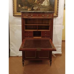 Raffinato ed unico secrétaire in legno massello di mogano finemente intagliato. Caratterizzato da una forma lineare ed elegante, con piano in marmo grigio con venature bianche. Il secrétaire presenta inoltre serrature e chiavi in bronzo fuso a cera persa e dorato, estremamente uniche e particolari, tipiche marsigliesi. Il mobile è dotato di un cassetto sotto il piano, e di uno sportello ribaltabile che apre su diversi ripiani e sei piccoli cassetti, ergonomici per riporre oggetti. Lo sportello ribaltato è inoltre ornato da un rivestimento in pelle, con incisioni dorate, che donano ulteriore eleganza ed era utilizzato per la scrittura. La parte terminale è infine costituita da due sportelli, che aprono su due ripiani, di cui quello inferiore presenta una serratura a cassaforte. Si tratta di un secrétaire di grande gusto e raffinatezza, in grado di donare un tocco di classe ed antichità a qualsiasi ambiente. Manifattura francese del periodo Napoleone III, intorno alla metà del XIX secolo.