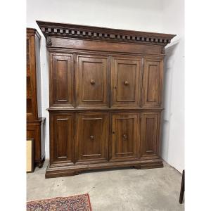 Crerdenza doppio corpo ( canonica ) tutta costruita in noce con due sportelli nella parte inferiore e due sportelli nella parte superiore incorniciata sul fronte e fianchi con maniglioni laterali cappello con cornice aggettante base modanata su piedi a mensola