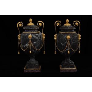 I due vasi spiccano per la finezza delle decorazioni in bronzo e la particolarità del marmo scelto.