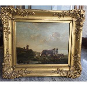 Olio su tavola paesaggio fiammingo con mucche e contadini metà del seicento