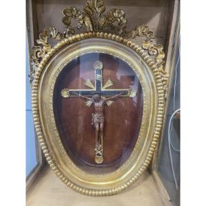 Bellissimo Cristo in croce laccata e dorata inserito in una grande teca/cornice dorata.