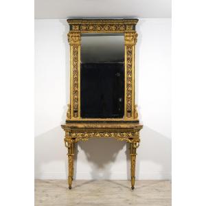 Questa consolle, corredata da specchiera, è stata realizzata a Genova in epoca neoclassica, verso la fine del XVIII secolo. La consolle presenta un piano in marmo lastronato in Broccatello di Spagna che segue il profilo della struttura, con angoli anteriori tagliati a 45 gradi. La fascia sottopiano si compone di una parte laccata a finto marmo Verde Antico, una doppia cornice intagliata a ovuli e motivi a dentelli dorati. Inferiormente, su una base laccata a finto Porfido spiccano decori intagliati a rilievo e dorati con motivi a ramage e foglie. Sugli angoli gli intagli presentano elementi fitomorfi inseriti in cornici. Dagli angoli originano le quattro gambe che si presentano come colonne di ordine dorico. Dal capitello caratteristico, con volute e intagli a ovuli dorati, dipartono colonne rastremate e scanalate, laccate a finto Porfido e dorate e a tronco di cono rovesciato. Nei secondi due terzi di colonna, una delicata decorazione scolpita e dorata si presenta come rami fogliati che ricoprono il fusto. I piedi sono sferici e in legno laccato. Dai capitelli dipartono festoni e ghirlande in legno dorato e intagliato a foggia di frutti che contribuiscono ad arricchire la raffinata decorazione della consolle, creando un leggero movimento. La specchiera riprende la decorazione della consolle. Di forma quadrangolare, si compone di una base in legno laccato a finto marmo Verde Antico su cui poggia una cornice intagliata e dorata. Gli altri lati della specchiera presentano, all’interno di riserve dorate, su uno sfondato laccato a finto Porfido, il medesimo ornato della fascia sottopiano della consolle: da vasi di gusto classico laccati a finto Lapislazzulo con basi laccate a finto Verde Antico, originano ramage di foglia di vite con foglie dorate che percorrono lungo tutto il perimetro. Ai lati smuovono la composizione due decori in legno dorato scolpito con una voluta centrata da un fiore che si sviluppa verso l’alto in una grande foglia. I lati verticali della cornice si concludono con eleganti capitelli dorati con volute e elementi fogliati e ghirlande. La cornice termina verso l’alto con una fascia scolpita con riserve a motivi a dentelli e ovuli dorati e fascia laccata a finto marmo Verde Antico. La consolle e la specchiera presentano un progetto d’insieme molto elegante e raffinato. Di grande decoratività ed effetto scenico, sono molto luminose e leggiadre, facilmente collocabili in qualsiasi contesto d’arredo, antico o moderno, in cui apporteranno il fascino intramontabile dell’oro e del gusto neoclassico.