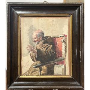 Bellissimo foglio raffigurante frate barbuto seduto di scorcio su antico seggiolone e dipinto con grande cura ad acquarello, ci mostra una grande freschezza e velocità di esecuzione. Non siamo riusciti a decifrarne la firma.