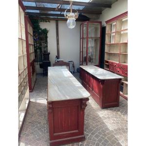 ambiente di negozio storico italiano laccato rosso in patina originale.