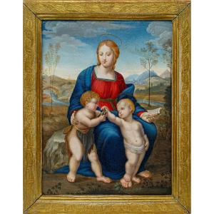 Questa raffinata opera su pergamena, risalente al XVIII secolo, si inserisce pienamente nel solco della colta tradizione neoclassica che vedeva nella riproduzione dei capolavori del Rinascimento non una semplice esercitazione tecnica, ma un atto di devozione estetica e di studio filologico verso i canoni della bellezza ideale. L'opera riproduce con minuziosa perizia la celebre Madonna del Cardellino di Raffaello Sanzio, un’iconografia che nel Settecento conobbe una rinnovata fortuna grazie alla riscoperta del classicismo e alla ricerca di un’armonia compositiva piramidale e aggraziata, qui fedelmente restituita nella dolcezza dei volti e nel dialogo silenzioso tra la Vergine, il piccolo San Giovanni e il Bambino.