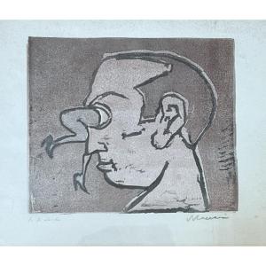 Affascinante prova di stampa di Mino Maccari, uno dei grandi maestri dell'incisione e della satira italiana del Novecento. L'opera presenta un ritratto di profilo dal marcato carattere surrealista: dall'occhio del personaggio spuntano gambe femminili elegantemente calzate, un'audace metafora visiva del desiderio o dello sguardo maschile, temi ricorrenti e spesso caustici nell'arte di Maccari.