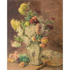 Questo grande acquarello mantiene ancora intatta, sotto il vetro originale, la freschezza dei suoi colori: un vaso in porcellana giapponese ricolmo di un mazzo di fiori, garofani e crisantemi, accanto al quale è poggiato un ventaglio orientale, un soggetto intriso di quel giapponismo tanto in voga tra la fine del XIX e l'inizio del XX secolo. La sua abilità di pittore accademico e naturalista si coglie nella precisione del disegno come nello studio delle luci, dalle tonalità dorate del tramonto che, entrando da una finestra, hanno illuminato il soggetto.