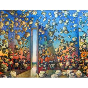 La composizione si articola attorno a una struttura architettonica essenziale: aperture e varchi geometrici si stagliano in un paesaggio irreale, mentre una moltitudine di forme sferoidali e pietrose sembra fluttuare nello spazio, sospesa tra interno ed esterno.