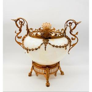 Fioriera da tavolo di grandi dimensioni con funzione di «coprivaso» in vetro opalino, Francia, XIX secolo. Base in bronzo dorato con inclusioni gialle. Cornice traforata con ricco decoro a rilievo, poggiante su tre piedini a forma di zampe di capra. Manici laterali rimovibili.