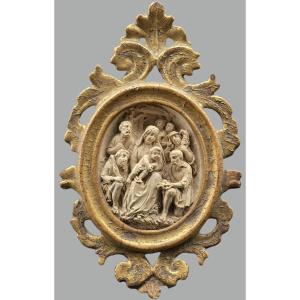 Raffinata scultura devozionale ovale raffigurante una Adorazione dei Pastori, realizzata in spuma di mare (meerschaum), materiale apprezzato per la sua morbidezza e per la capacità di restituire dettagli minuti e delicati.La scena presenta la Vergine con il Bambino, affiancata da San Giuseppe e da figure di pastori in atteggiamento devoto, secondo una iconografia tradizionale di grande suggestione.Il rilievo è inserito entro una elegante cornice ovale in legno intagliato e dorato a foglia oro, di produzione nord italiana (area veneta o emiliana), databile alla fine del XVIII secolo. La cornice, caratterizzata da un vivace andamento traforato di gusto rocaille, conserva una bella patina antica con naturali segni del tempo.La perfetta aderenza del rilievo all’alloggiamento ovale e l’assenza di adattamenti evidenti suggeriscono che l’insieme sia verosimilmente coevo o comunque concepito unitariamente.Oggetto di grande fascino, a metà tra arte sacra e decorazione, ideale sia per collezionismo che per ambientazioni di gusto.Misure:Cornice: cm 21 x 13Ovale interno: cm 10,5 x 8Spessore: cm 3Condizioni complessivamente buone, con segni del tempo e piccole usure alla doratura.Per ulteriori informazioni, foto o dettagli tecnici, non esitate a contattarci. Spedizioni disponibili in tutto il mondo con imballaggio professionale.