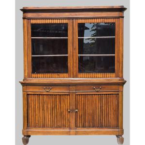 Importante credenza libreria di area veneta, databile al periodo Carlo X, nei primi decenni del XIX secolo, realizzata in legno di noce massello.Il mobile si distingue per l’elegante impianto architettonico e per la raffinata lavorazione a scanalature verticali che caratterizza i fronti, motivo decorativo di gusto tardo neoclassico, già diffuso in ambito Luigi XVI e qui reinterpretato con maggiore sobrietà e solidità tipiche del periodo successivo.La parte superiore è composta da due ante vetrate apribili, che custodiscono ripiani interni ideali per libri o oggetti da esposizione.La parte inferiore presenta invece un elemento di particolare interesse: le ante scorrono lateralmente a serrandina rientrante all’interno del mobile, soluzione tecnica ricercata e funzionale, meno comune rispetto alle classiche ante battenti.Due cassetti lineari separano i due corpi, mantenendo equilibrio e proporzione nell’insieme.Dimensioni: larghezza 180 cmprofondità 62 cm (parte inferiore), 56 cm (parte superiore)altezza 230 cmIl mobile si presenta in buono stato conservativo, con patina del tempo e segni d’uso coerenti con l’epoca.Per ulteriori informazioni, foto o dettagli tecnici, non esitate a contattarci.Spedizioni disponibili in tutto il mondo con imballaggio professionale.